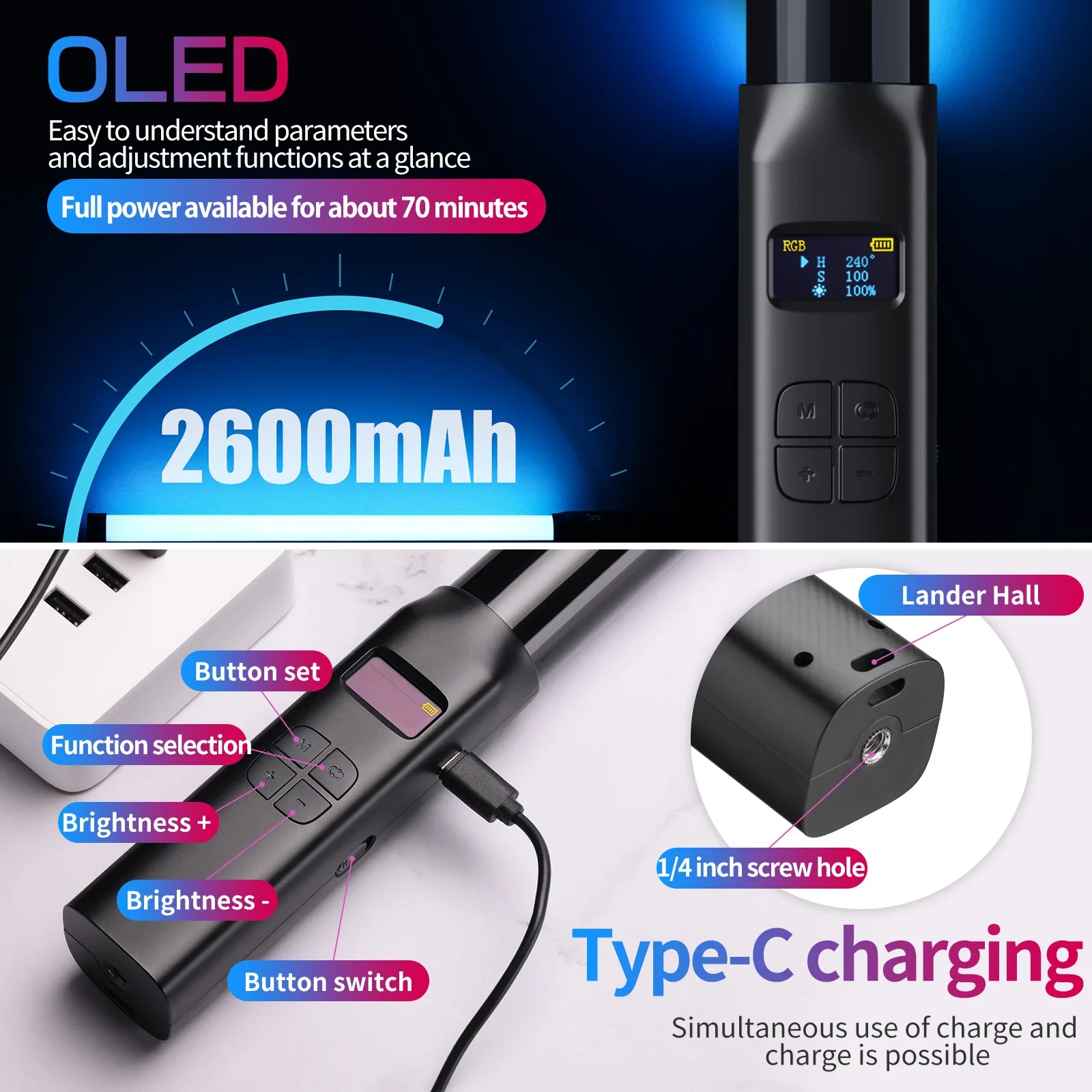 Built-in 2000mAh lithium battery , can be used for 70 minutes at maximum brightness