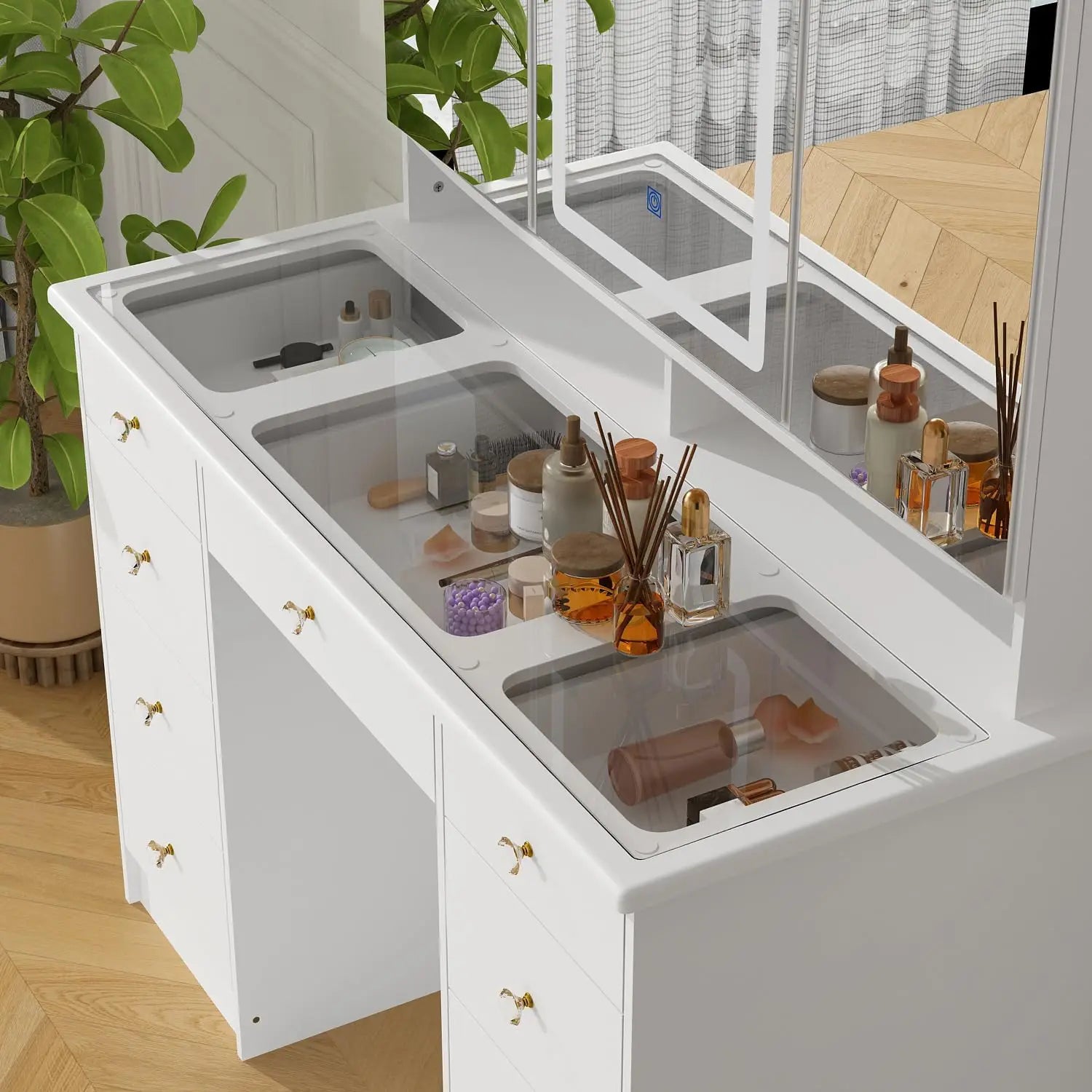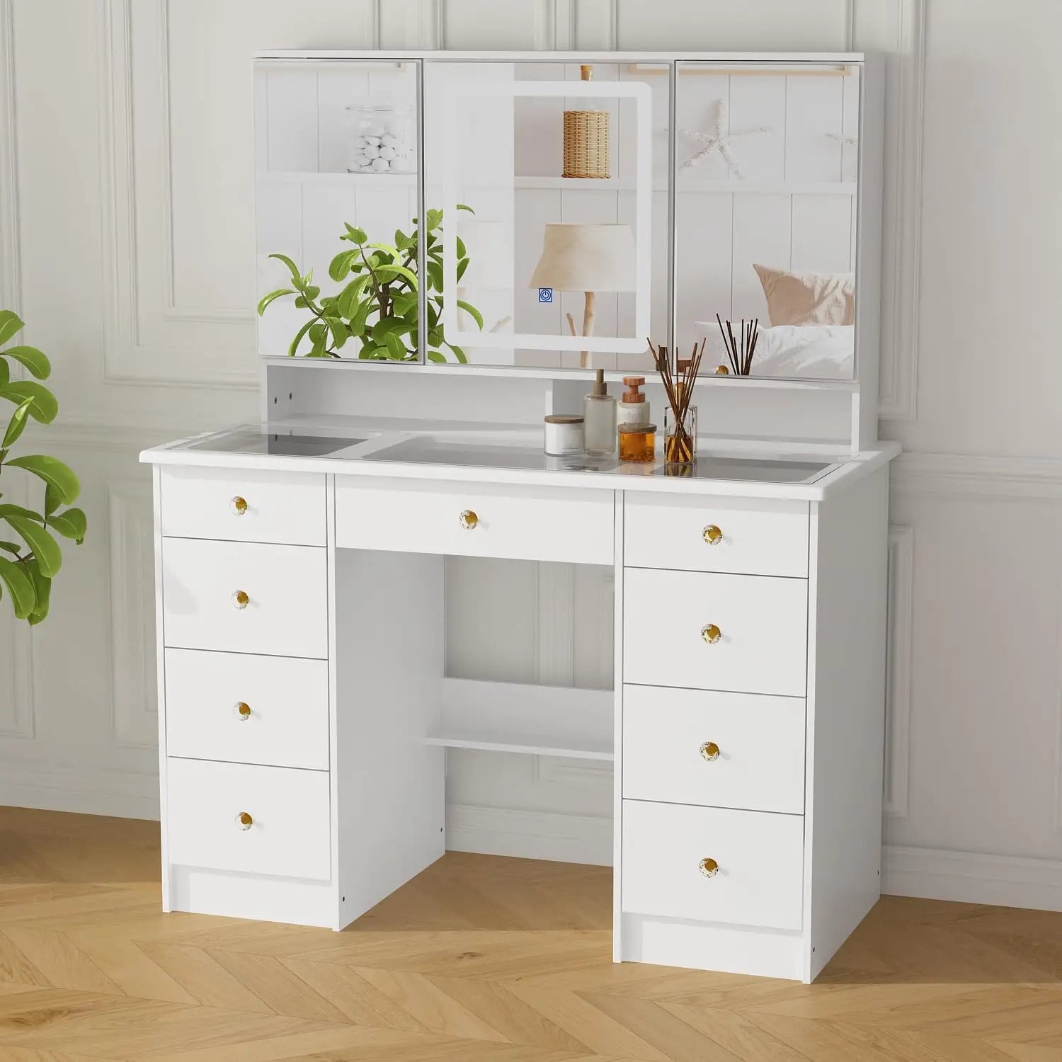 - [Vanity Desk with Lighted Mirror] - The vanity could help you finish everday skincare or makeup routine smoothly and in comfort. The makeup vanity comes with trifold lighted mirror, which 2 of them are foldable and work as doors of storage shelves, allowing you to check your exquisite makeup from different angles as well. The glass top makes it convenient to check the items in top drawers. Matched with muted white finish, the vanity could fit different decoration styles easily.