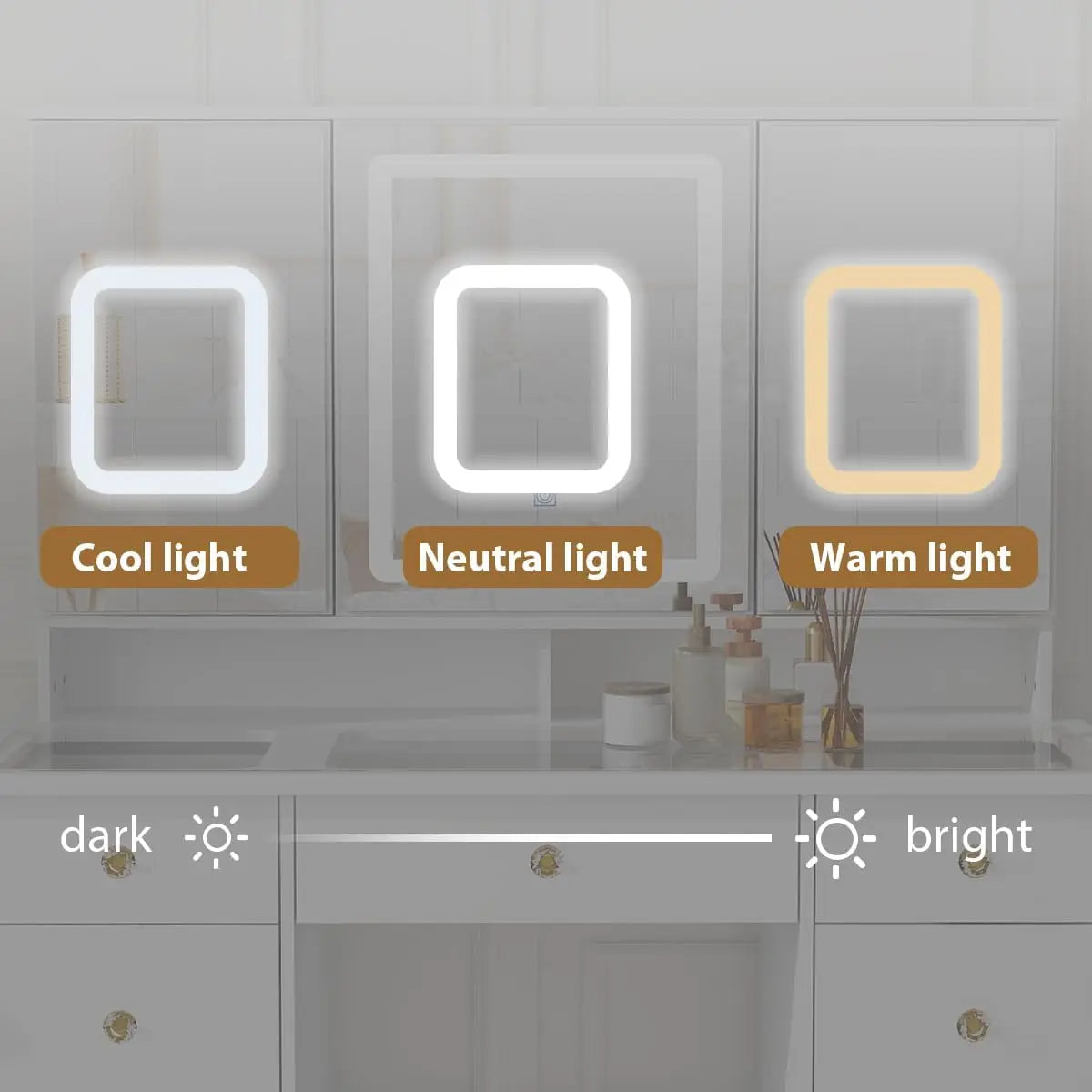 - [Adjustable Lighting] – The mirror of vanity desk comes with LED light strip, providing 3 different colors, including cold white, natural light and warm yellow. In additon, the brightness is also adjustable. To suit different usage and scenarios, you could simply control the lighting by clicking the sensor button. Short press for color adjustment, long press for brightness adjustment.