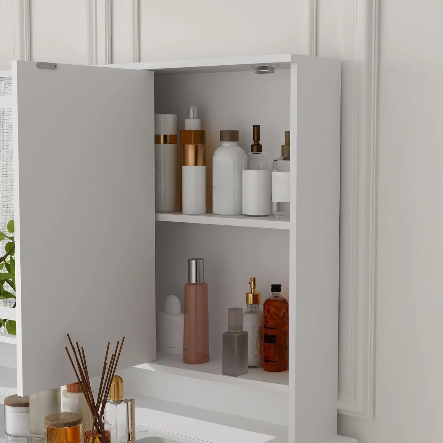 - [Generous Storage Capacity] – With abundant and various storage space, clutter can be kept at bay in one vanity desk. The hidden shelves behind mirror door and 9 drawers are ideal for accommodating cosmetics, skincare and other items in different sizes. The spacious tabletop keeps your perfumes and everyday objects within easy reach.