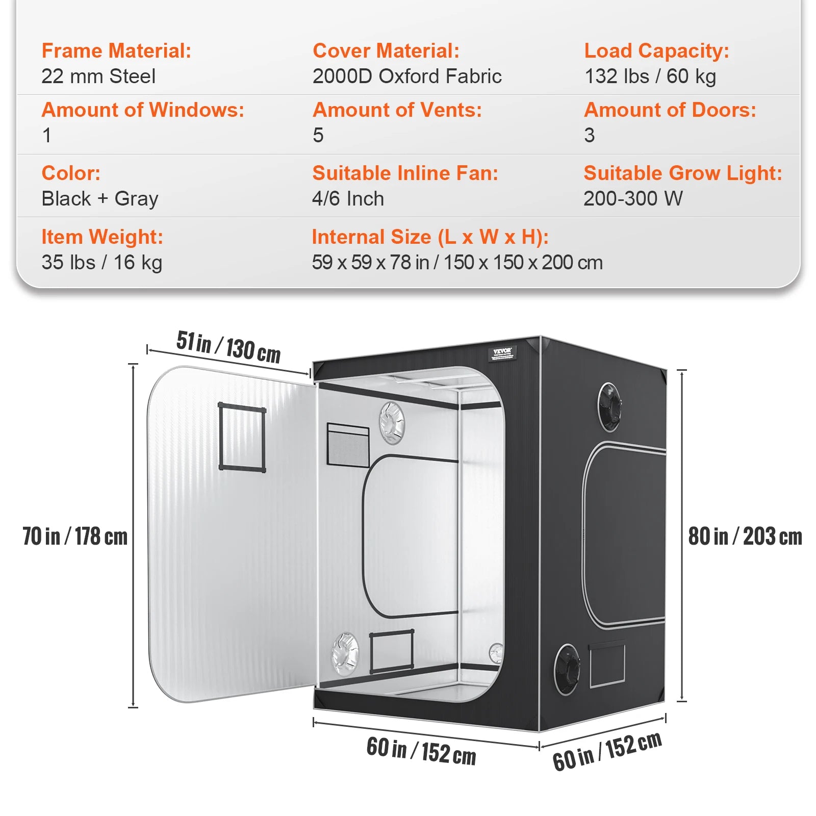Built for Quick Installation: Are you ready to watch your plants flourish? VEVOR's advanced grow tent is made of robust 19 mm steel, forming a stable structure that can hold up to 132 lbs. It features metal connectors that are easy to assemble without the need for additional tools, saving time. Additionally, the tent has extra thickened triangular layers that prevent it from breaking, ensuring durability.