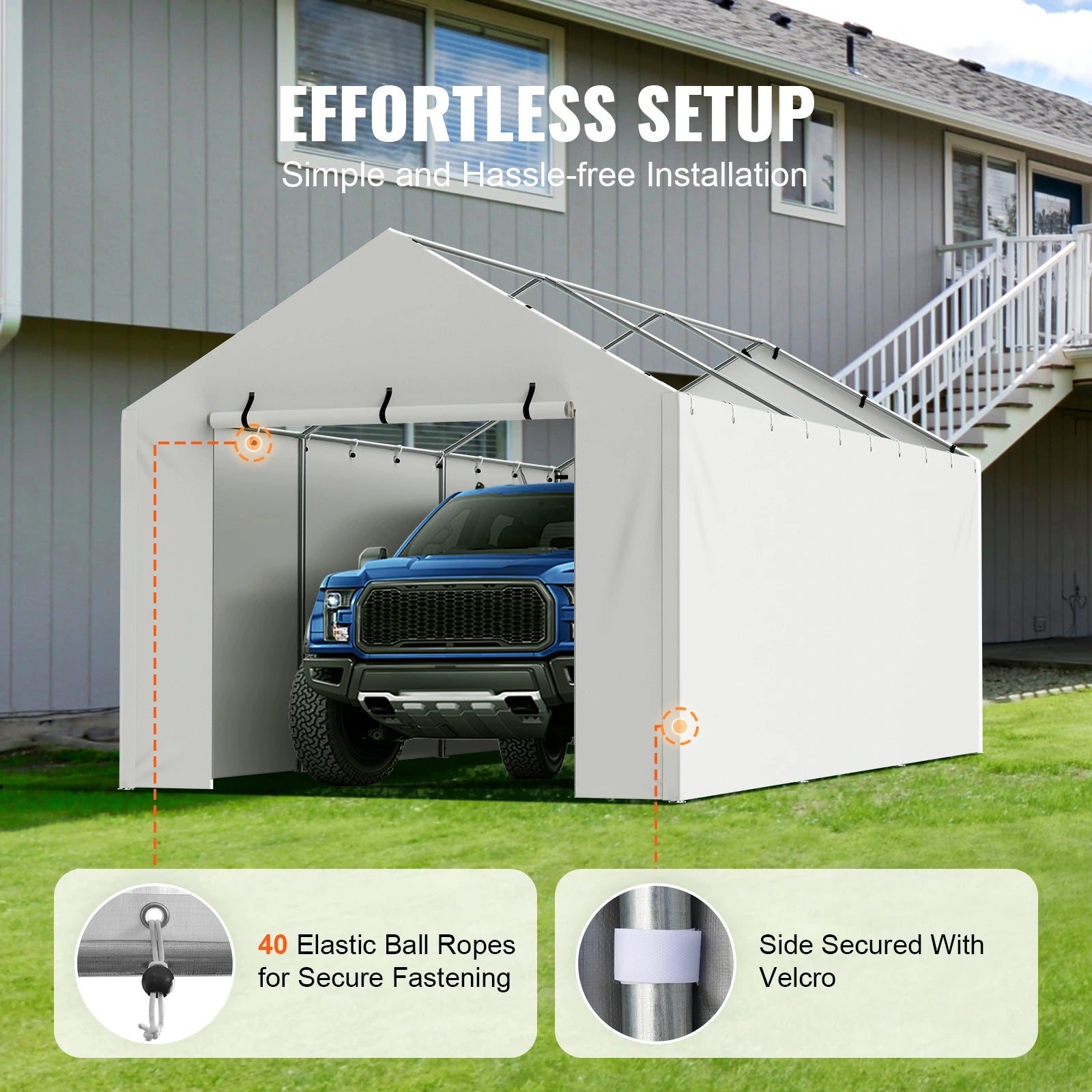 Equipped with aluminum grommets, the car port can be securely fastened using elastic ball bungees without the need for tools, making installation simple and effortless.