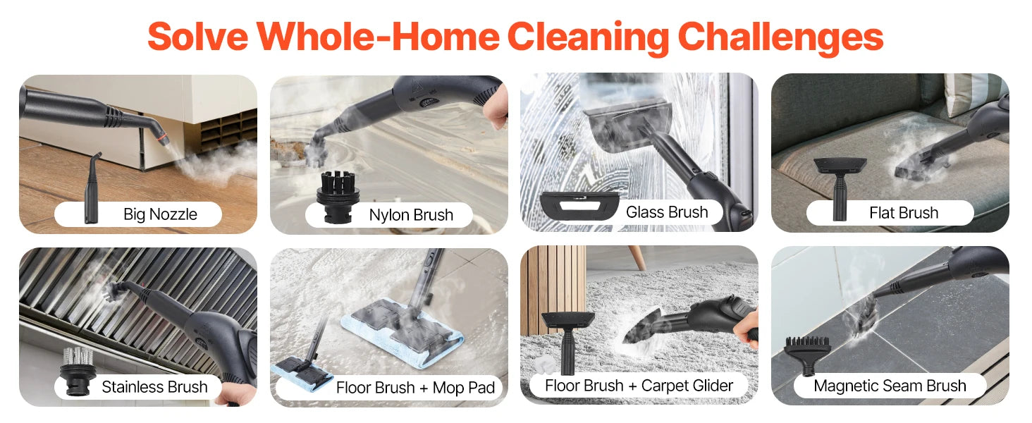 23 Accessories Included: Our grout steam cleaner comes with two extension tubes, a floor brush, two mop pads, a carpet glider, three nylon brushes, two stainless brushes, two magnetic seam brushes, a flat brush, a cloth cover, a glass brush, a wiper, a big nozzle, a straight nozzle to tackle every cleaning task. Note: A small amount of water spray is normal during use.