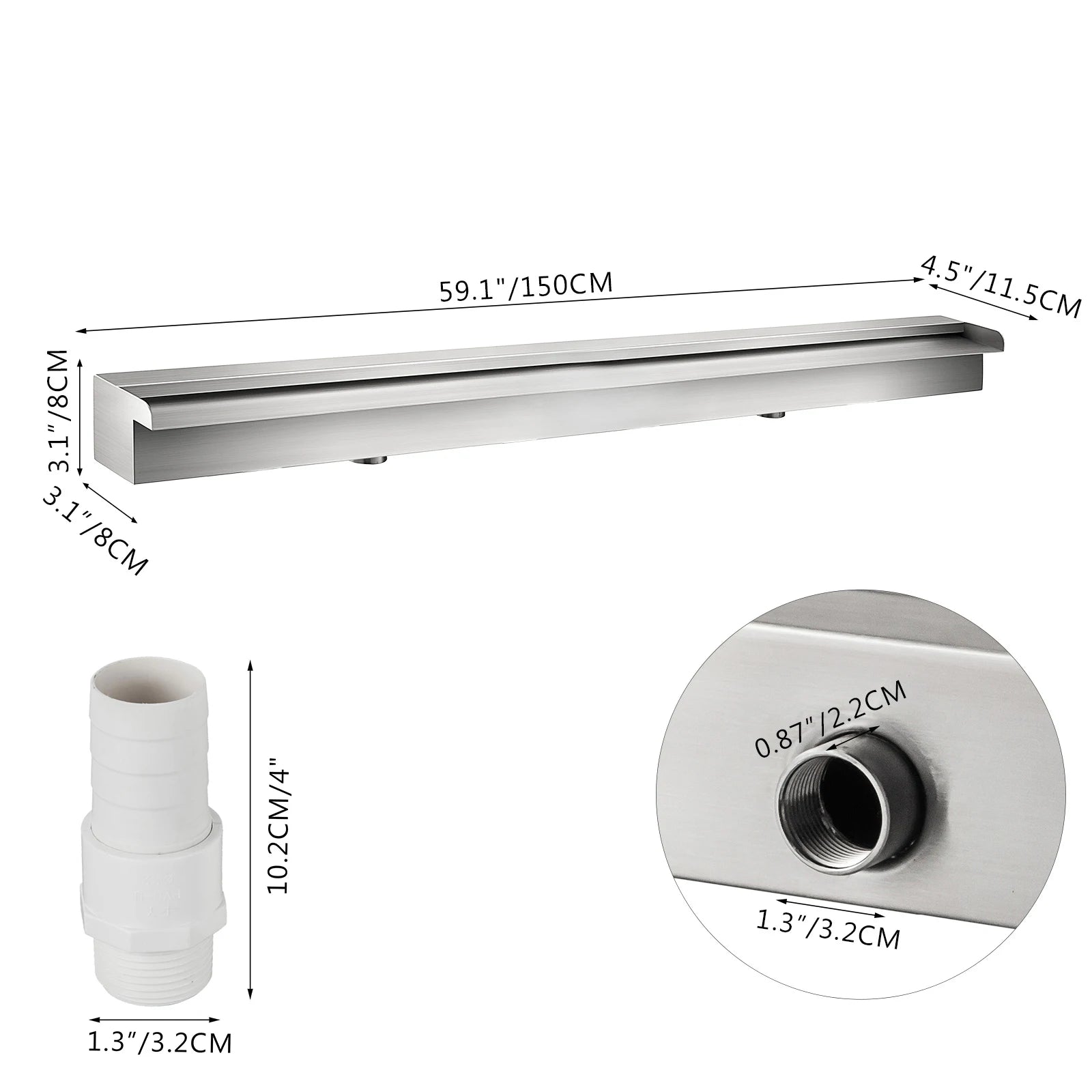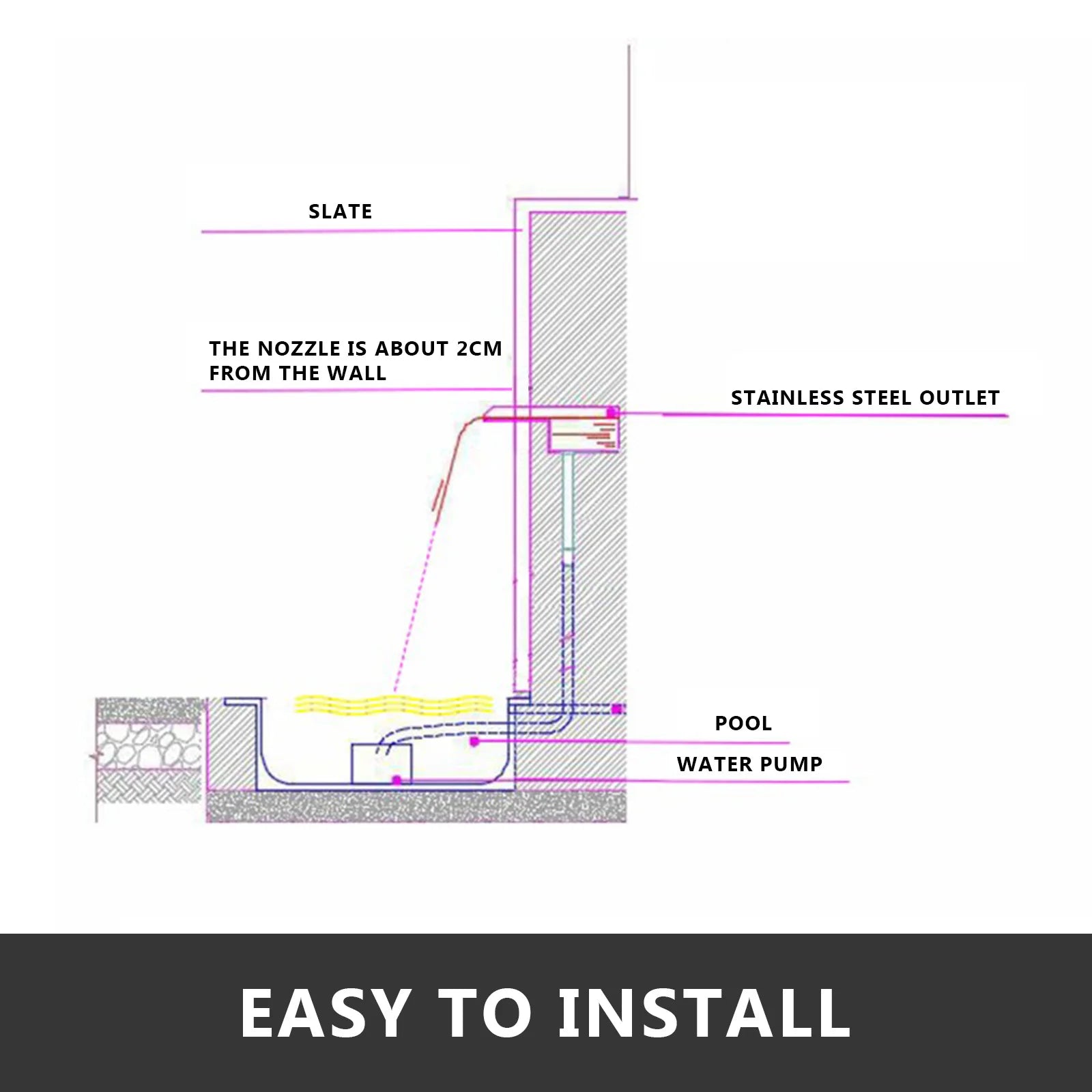 Pool Fountain Dimension: Pool waterfall fountain's size: 23.6" x 4.5" x 3.1". Water inlet's diameter: 1.3 in. Water flow width: 23.6 in. It makes a decorative addition to your garden, patio, pond, or swimming pool and makes them more elegant, fashionable, and beautiful.