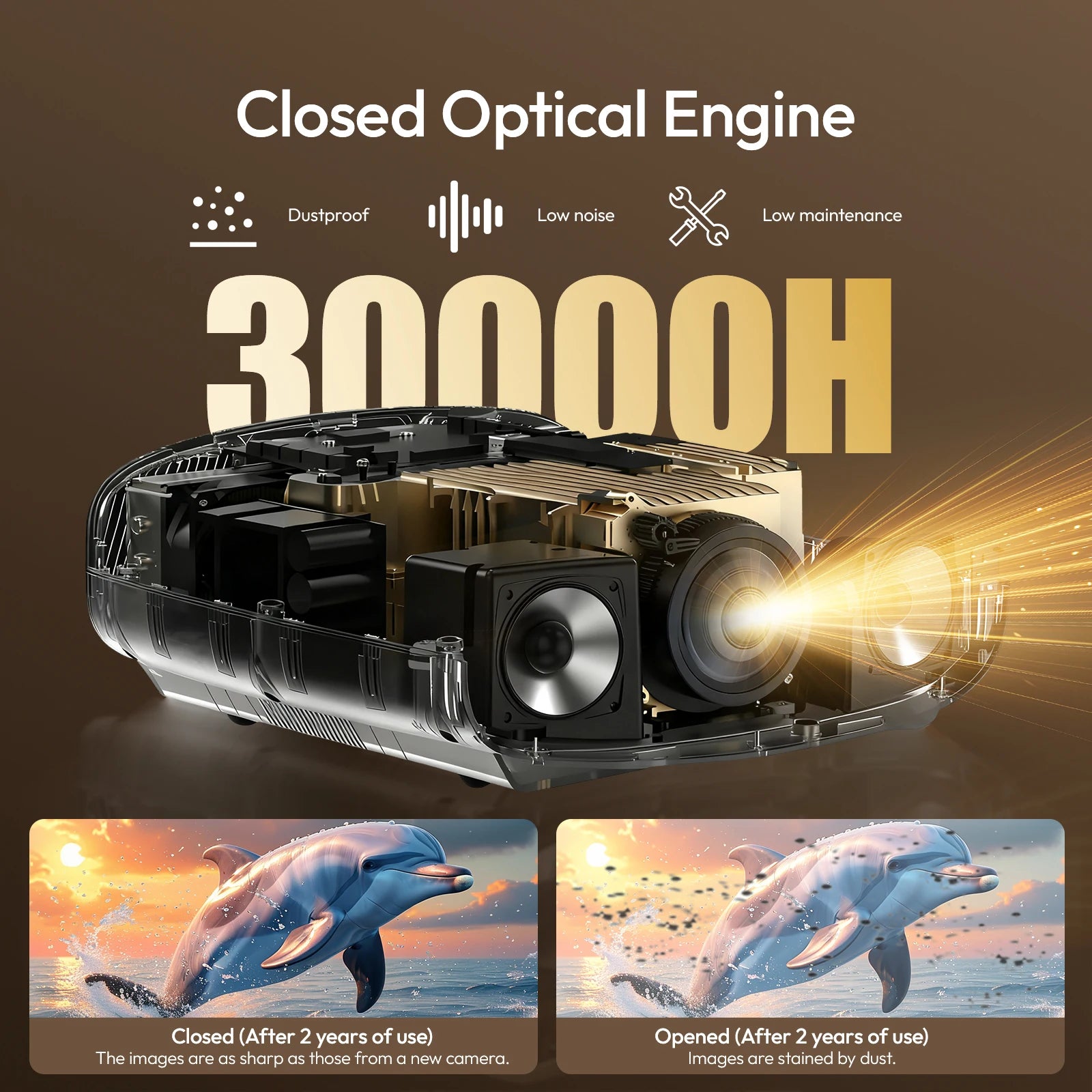 Closed optical design effectively prevents dust from entering the core optical components, significantly extending the life of the projector and keeping the image quality long-lasting and clear, it reduces the dust accumulation problem by more than 90% and avoids brightness degradation and color distortion due to contamination, which is especially suitable for pet homes or dusty environments, and at the same time, reduces the cost of maintenance, so you can enjoy the stability of high-quality images as the same.