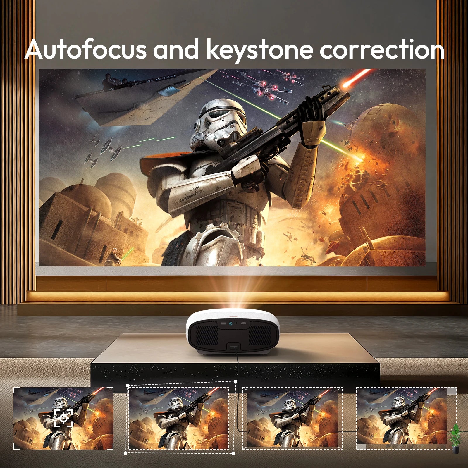 The projector auto-focus and auto-calibration function completely liberates the user's hands, instantly presenting a clear, square and perfect picture. Whether it's side projection, moving or adjusting the angle, the system can intelligently calibrate in real time, bidding goodbye to the traditional cumbersome manual calibration steps, so that every time you use it, it is as simple and efficient as a smart TV, and it truly realizes a zero-threshold cinema-level experience.