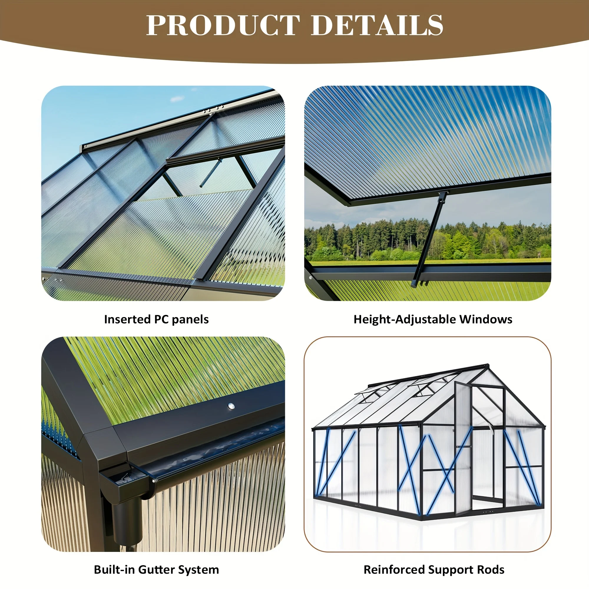 Practical details include side gutters for effective rainwater collection and structural reinforcement, as well as five-position adjustable roof vents and lockable doors to improve air circulation and provide easy access. These features create a sustainable and user-friendly environment for your gardening needs.