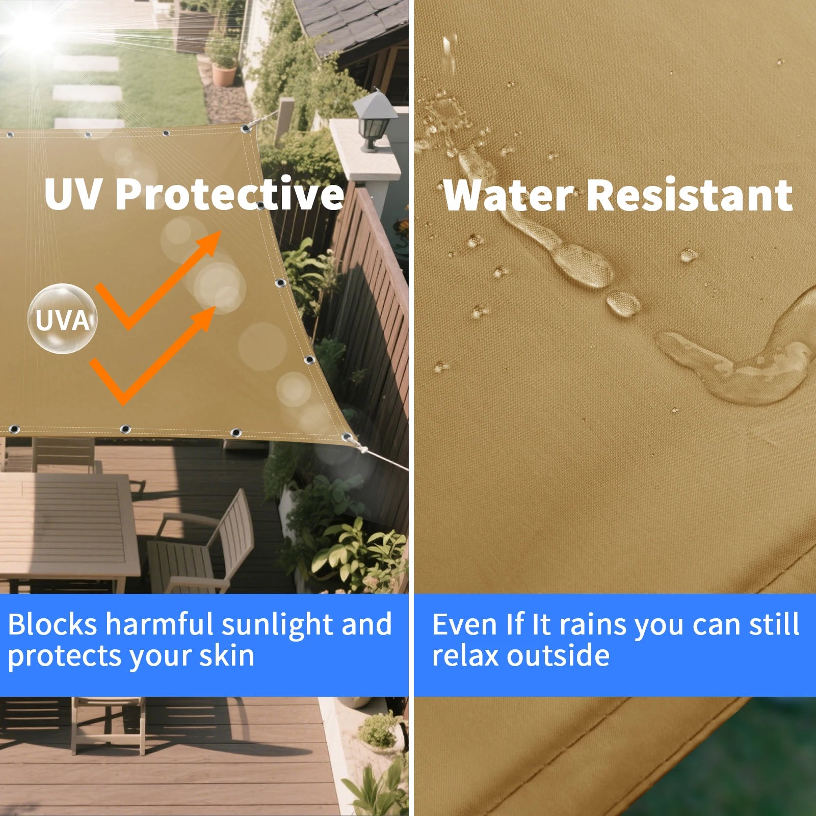 High quality: Shade sail made of 100% high quality and dense polyester fabric, can effectively achieve 95% UV protection and 90% shade rate. Can drastically reduce the temperature and create a cool, comfortable outdoor area. This outdoor shade sail is UV protected, waterproof, tear-resistant and can reach.