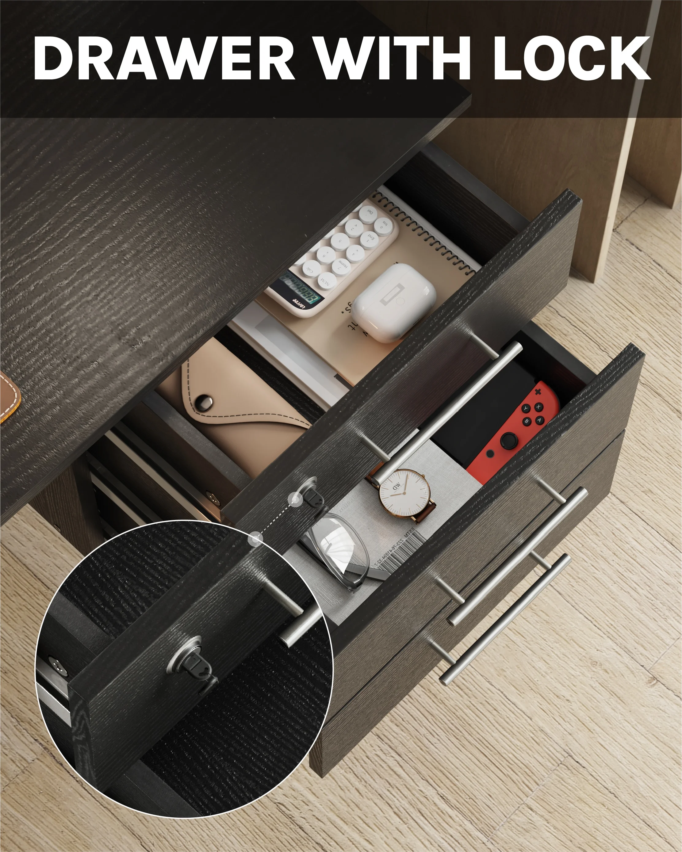 THOUGHTFUL CONSTRUCTION The white desk looks elegant and modern. The silver handles on the drawers brighten the eyes and make it easier to pull the drawers. The first drawer is equipped with lock and 2 keys to protect your privacy. Each drawer is equipped with a silent rail that does not make sharp noise when used.