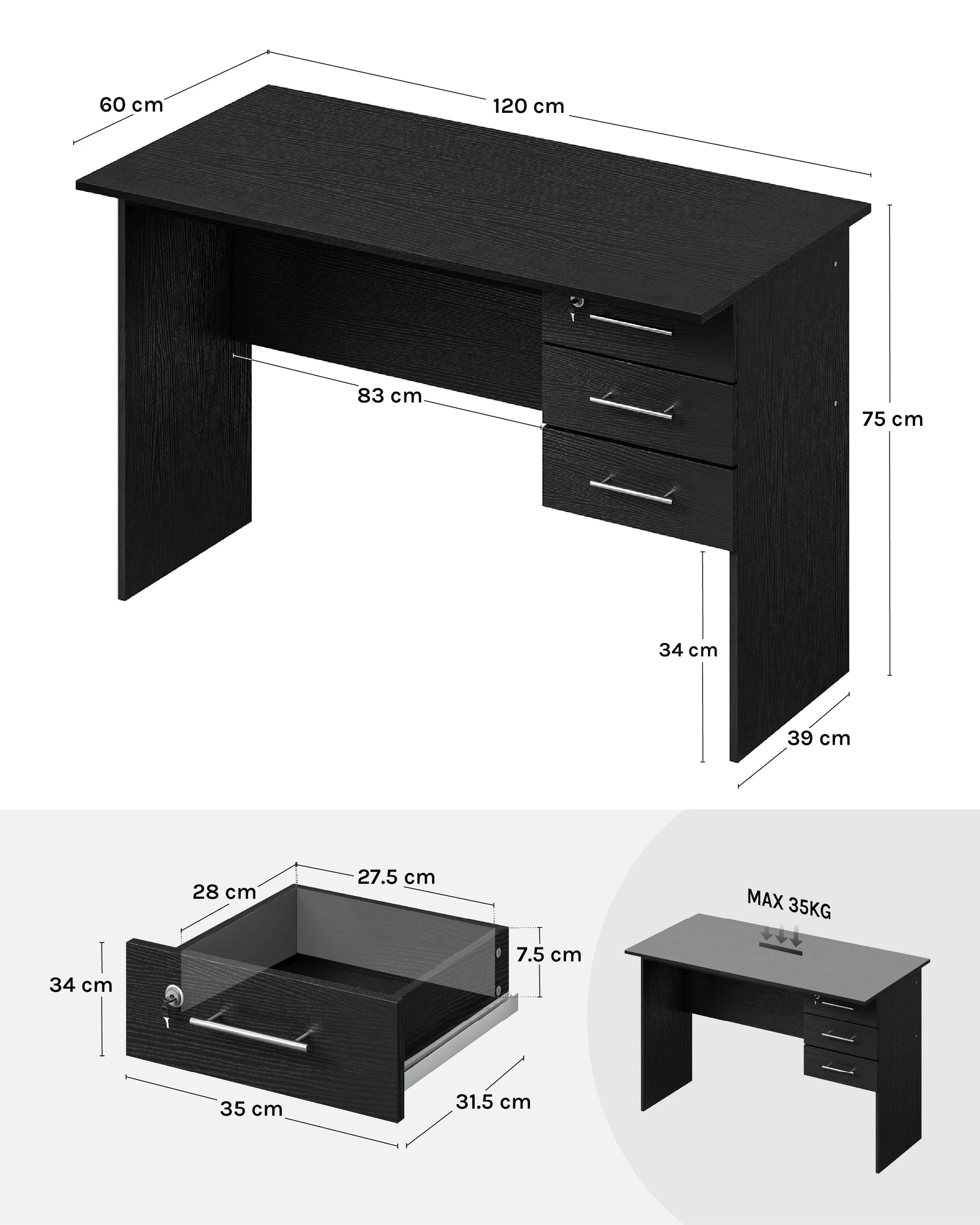 Size & Installation 120 x 75 x 59 cm (W x H x D), Drawer Size:35 x 12.8 x 31.5 cm (W x H x D). You can easily assemble the desk using the detailed assembly instructions (English language not guaranteed).