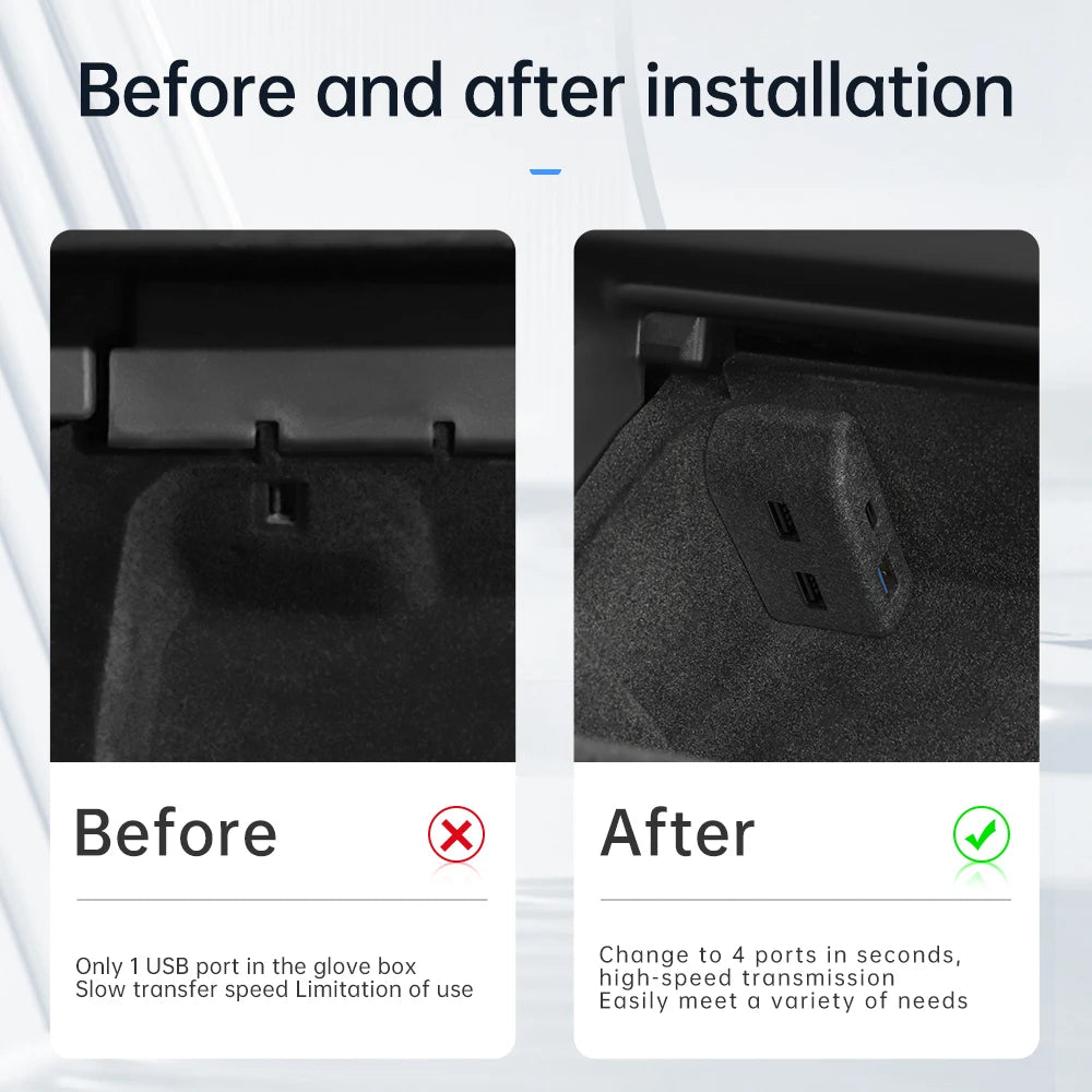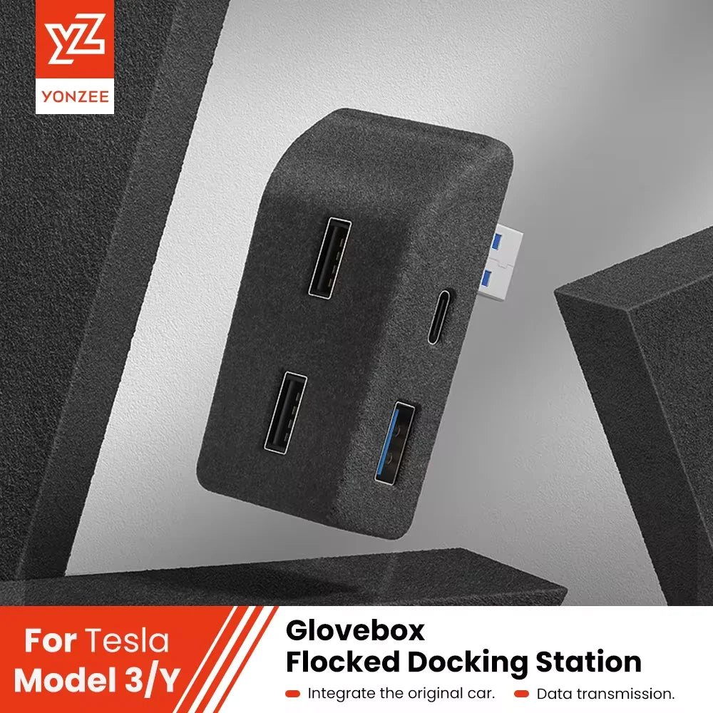 YZ Glove Box Docking Station For Tesla Model 3 Y Highland Juniper Quick Charger 4 USB Shunt Hub Flocking Adapter Powered Splitte