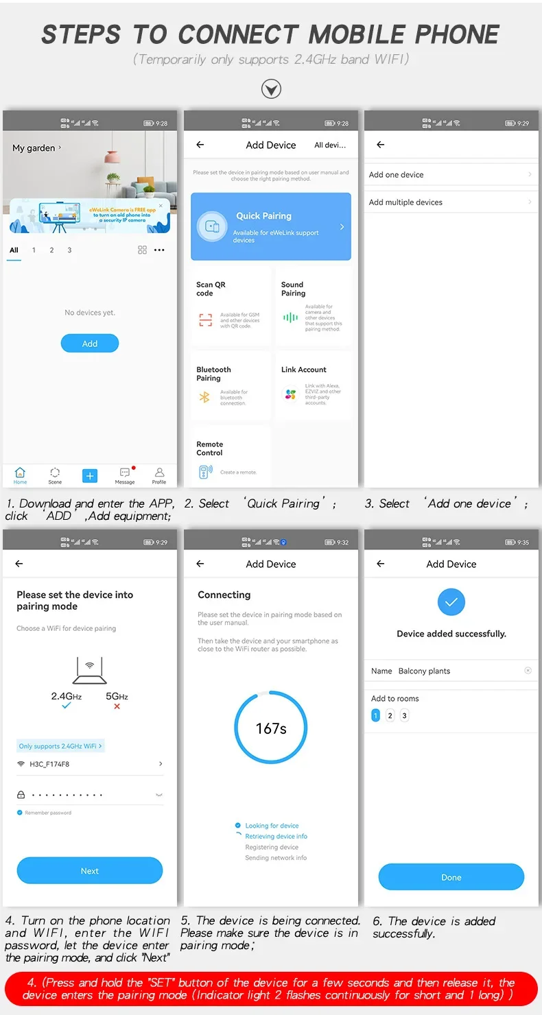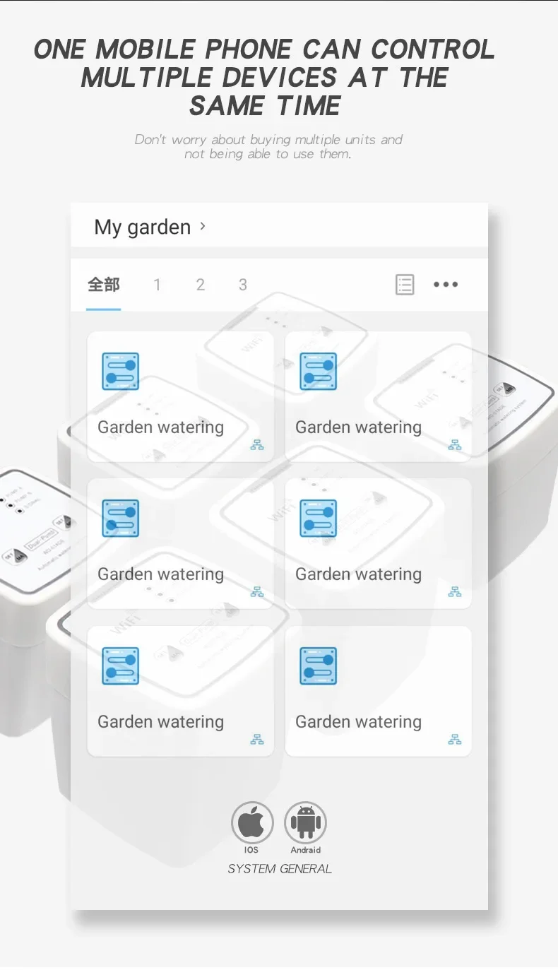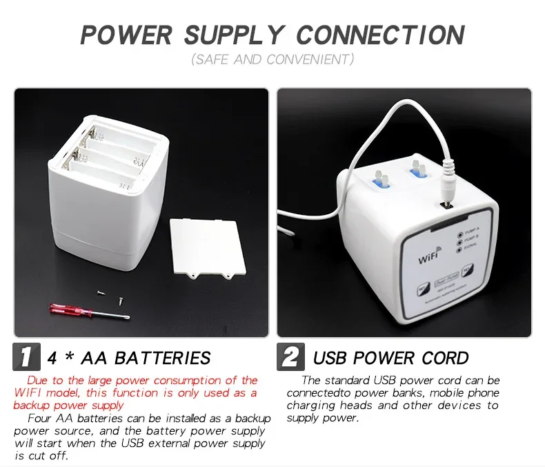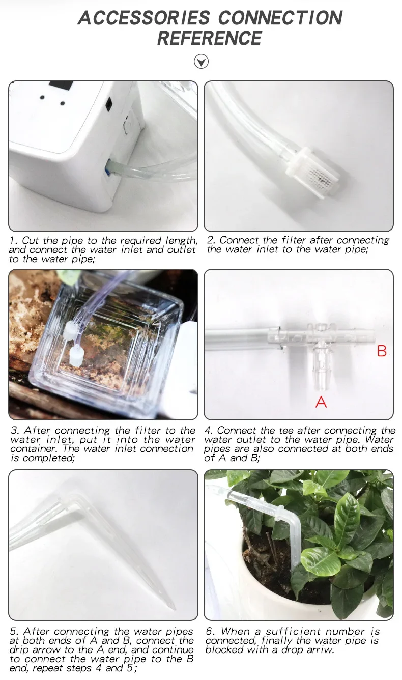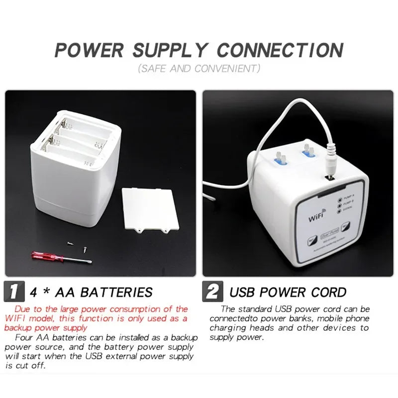 20 basins: 1 WIFI double pump host, 15 meters of hose, 20 tees, 20 drip arrows, 2 filters, 1 USB cable, 1 screwdriver, 1 instruction manual